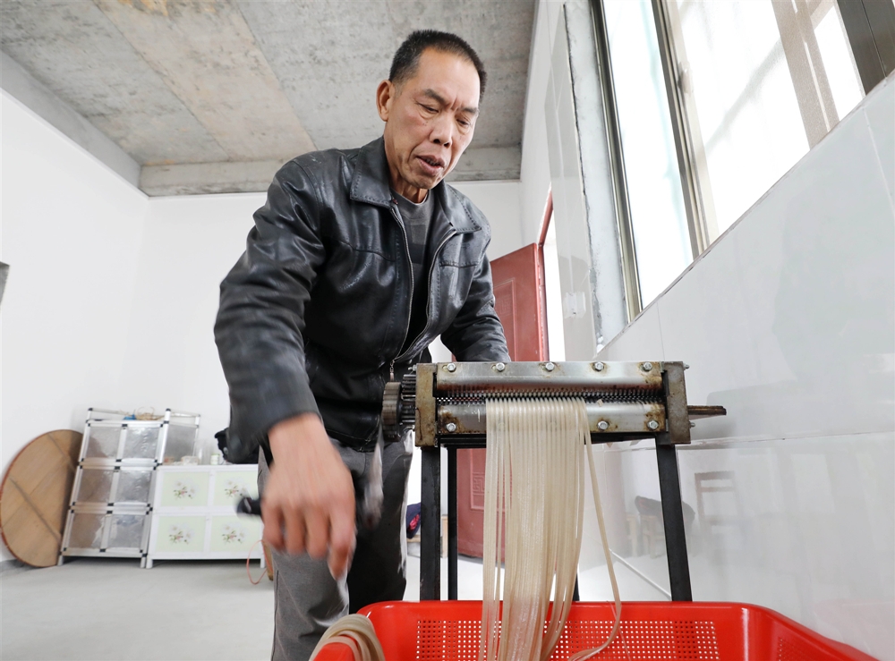 柳州市融安县浮石镇东江村的贫困户黄桥昌正在切割红薯粉条。(韦荣军 摄)