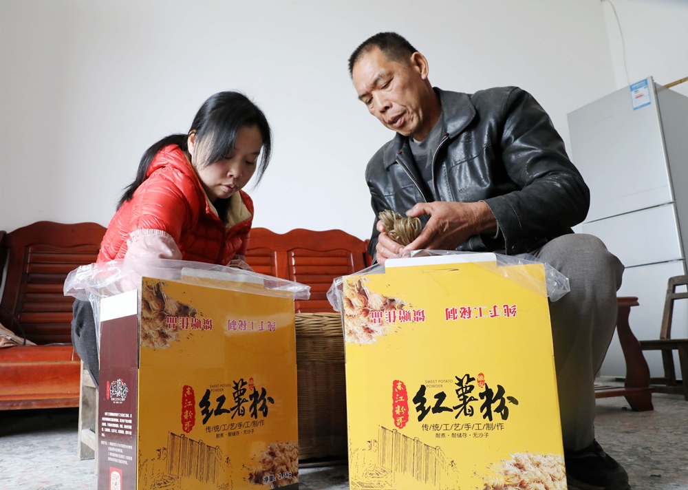 柳州市融安县浮石镇东江村,贫困户黄桥昌父女正在包装红薯粉准备销售。(韦荣军 摄)