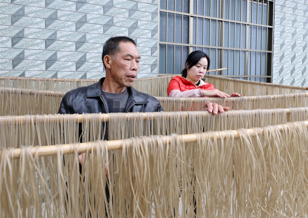 柳州市融安县浮石镇东江村的贫困户黄桥昌(左)一家利用晴好天气晾晒红薯粉。(韦荣军 摄)