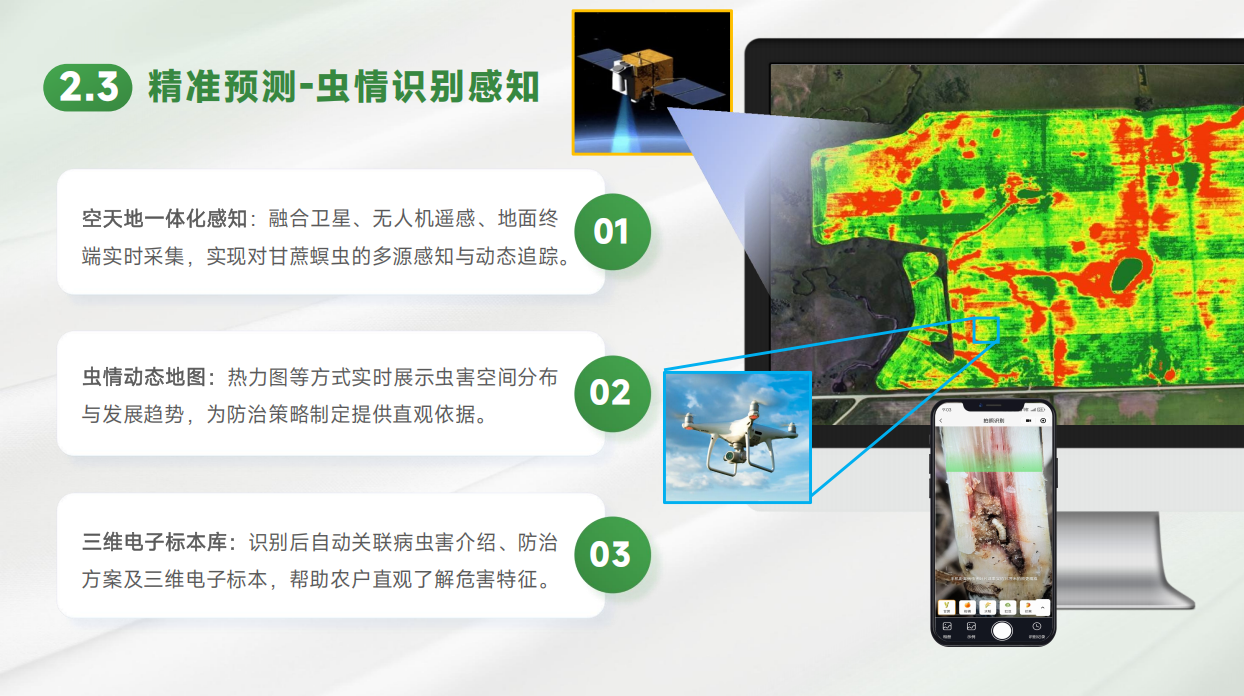 例如:在广西上思县昌菱农场的甘蔗基地,平台通过AI分析历史虫情数据和实时气象信息,预测出未来一周内甘蔗螟虫将进入产卵高峰期。平台立即生成释放方案,指导农户在特定区域释放赤眼蜂。