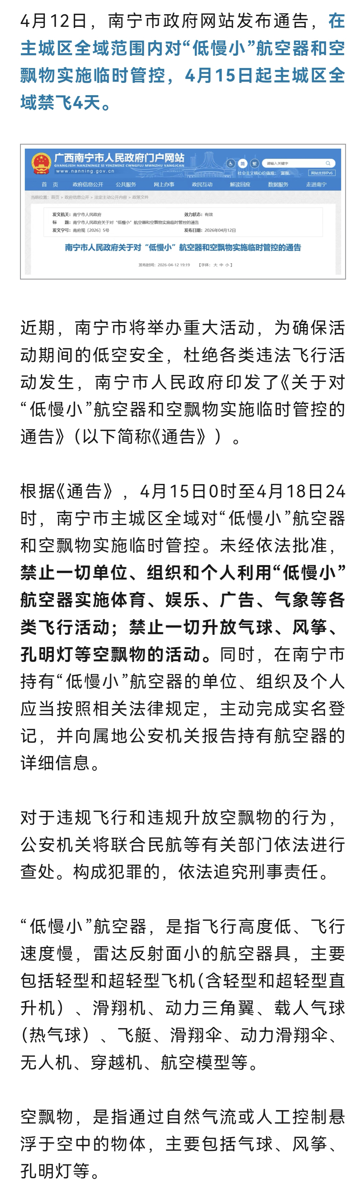 南宁发布通告:这4天,禁止放飞无人机、风筝等“低慢小”航空器和空飘物